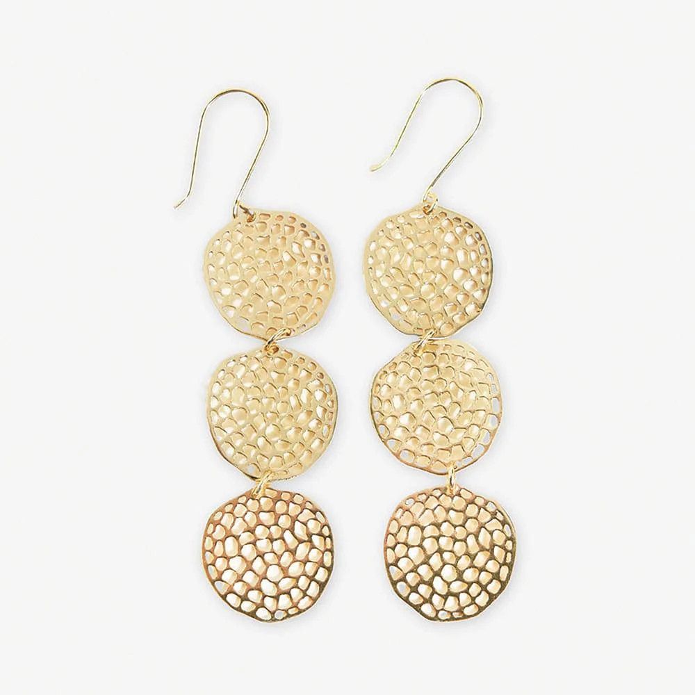 Elevate your everyday style with the eye-catching Gretchen Triple Disc Textured Drop Earrings. Crafted from warm brass metal, these lightweight earrings feature three graduated disc shapes descending in a linear drop design. At 3.5 inches long, the Gretchen Triple Disc Drops make an impactful yet refined statement.